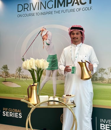 Throughout the tournament, we welcomed elite guests, dignitaries, and VIP clients, serving them with authentic Saudi coffee and premium dates. Our bespoke setup brought a touch of Middle Eastern elegance to the world of championship golf, offering a refined cultural experience that complemented the prestige of the event.